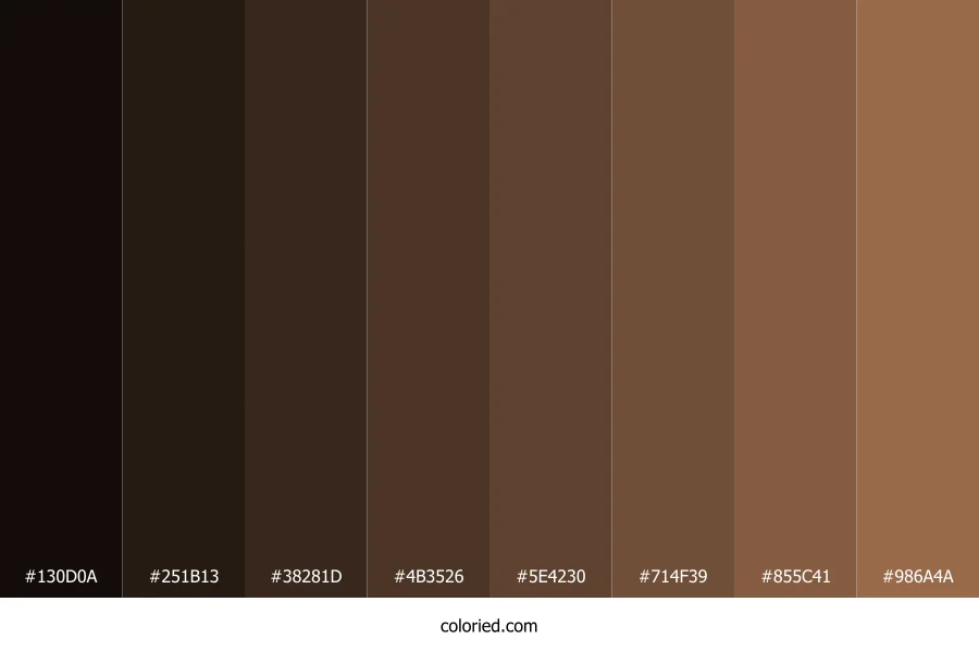 | #714F39 | 113, 79, 57 | 24, 33%, 33% | 0%, 30%, 50%, 56% | oklch(0.459 0.057 54) | |
