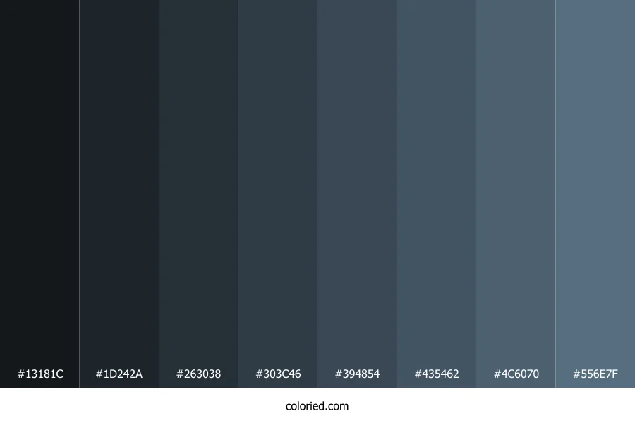| #1D242A | 29, 36, 42 | 208, 18%, 14% | 31%, 14%, 0%, 84% | oklch(0.256 0.015 244) | |