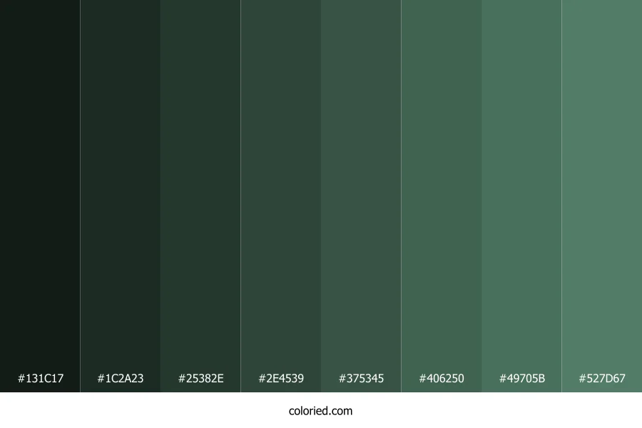 ![]() | #131C17 | 19, 28, 23 | 147, 19%, 9% | 32%, 0%, 18%, 89% | oklch(0.216 0.016 160) |