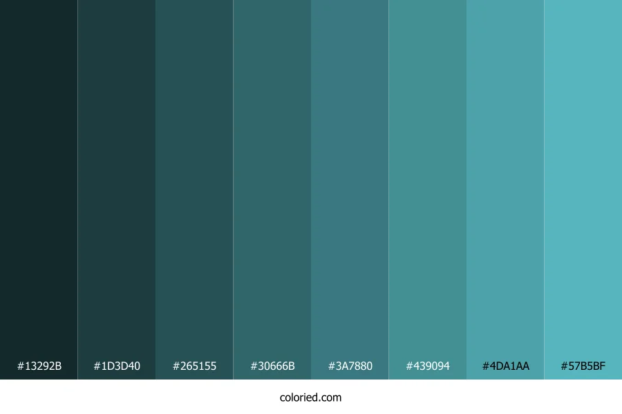 ![]() | #13292B | 19, 41, 43 | 185, 39%, 12% | 56%, 5%, 0%, 83% | oklch(0.264 0.028 203) |