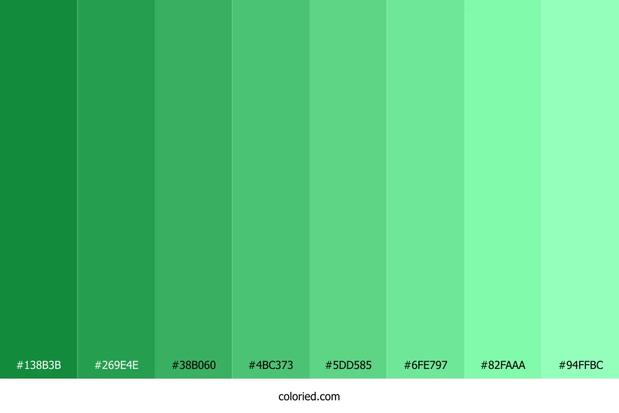 ![]() | #138B3B | 19, 139, 59 | 140, 76%, 31% | 86%, 0%, 58%, 45% | oklch(0.558 0.154 148) |