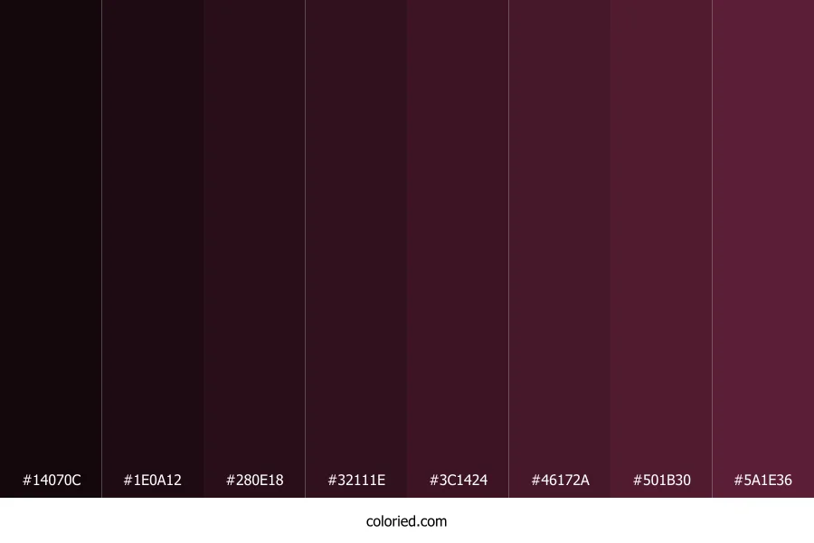 ![]() | #14070C | 20, 7, 12 | 337, 48%, 5% | 0%, 65%, 40%, 92% | oklch(0.152 0.026 355) |
