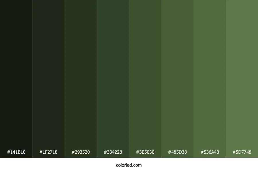 ![]() | #141B10 | 20, 27, 16 | 98, 26%, 8% | 26%, 0%, 41%, 89% | oklch(0.211 0.023 135) |