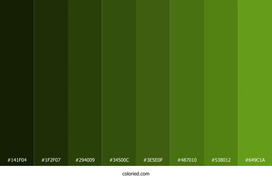 ![]() | #141F04 | 20, 31, 4 | 84, 77%, 7% | 35%, 0%, 87%, 88% | oklch(0.221 0.049 128) |