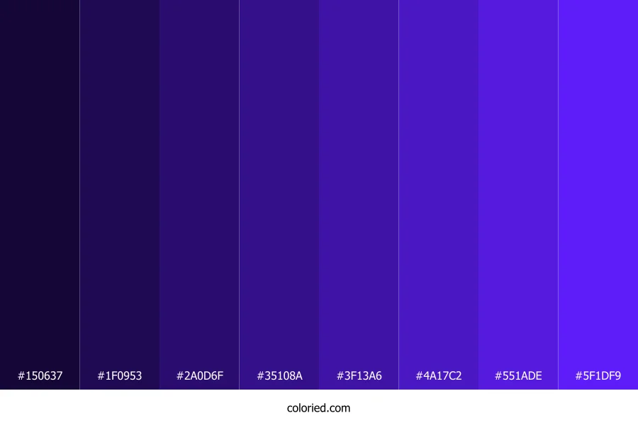 | #1F0953 | 31, 9, 83 | 258, 80%, 18% | 63%, 89%, 0%, 67% | oklch(0.238 0.120 286) | |