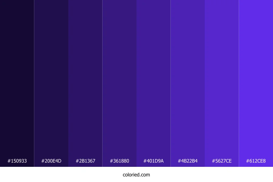 ![]() | #150933 | 21, 9, 51 | 257, 70%, 12% | 59%, 82%, 0%, 80% | oklch(0.189 0.078 290) |