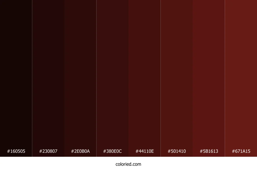| #2E0B0A | 46, 11, 10 | 2, 64%, 11% | 0%, 76%, 78%, 82% | oklch(0.210 0.058 25) | |