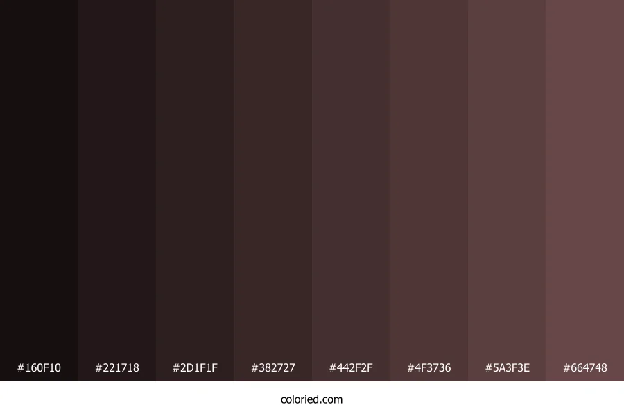 ![]() | #160F10 | 22, 15, 16 | 351, 19%, 7% | 0%, 32%, 27%, 91% | oklch(0.178 0.012 9) |