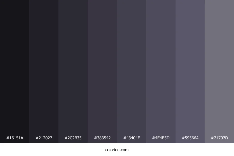 ![]() | #16151A | 22, 21, 26 | 252, 11%, 9% | 15%, 19%, 0%, 90% | oklch(0.199 0.010 295) |