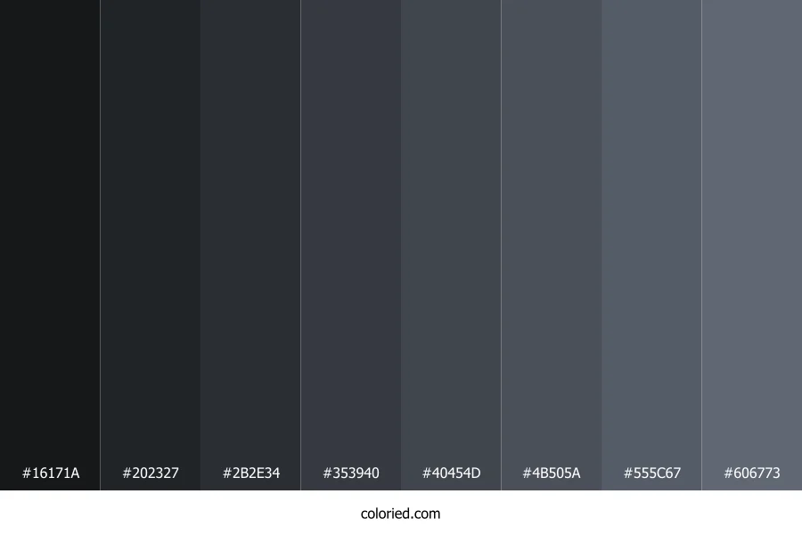![]() | #16171A | 22, 23, 26 | 225, 8%, 9% | 15%, 12%, 0%, 90% | oklch(0.205 0.006 271) |