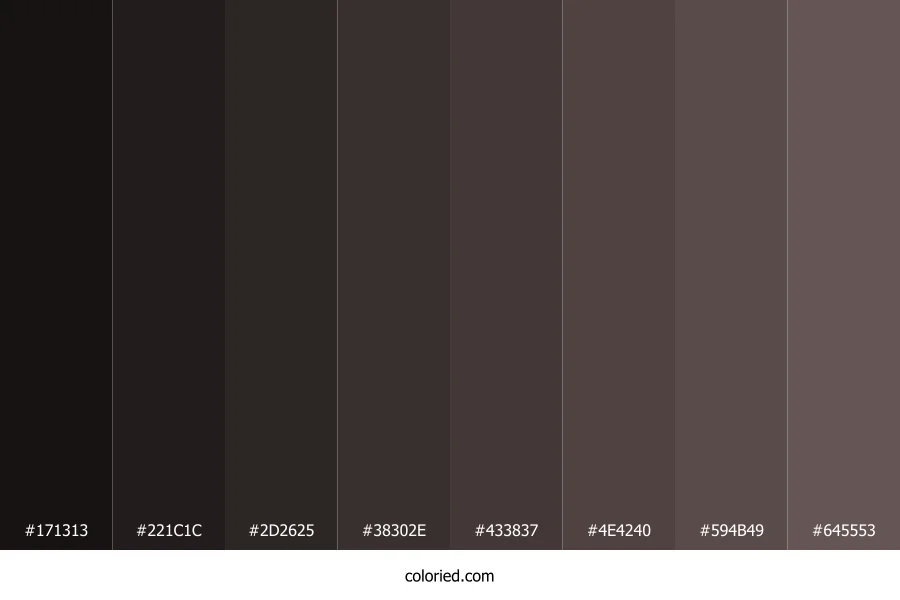 | #2D2625 | 45, 38, 37 | 7, 10%, 16% | 0%, 16%, 18%, 82% | oklch(0.276 0.011 27) | |