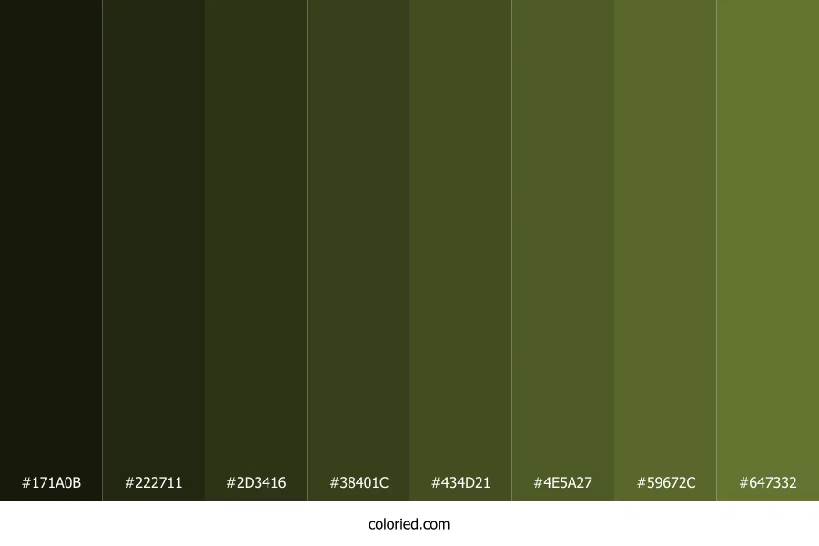 ![]() | #171A0B | 23, 26, 11 | 72, 41%, 7% | 12%, 0%, 58%, 90% | oklch(0.210 0.028 118) |