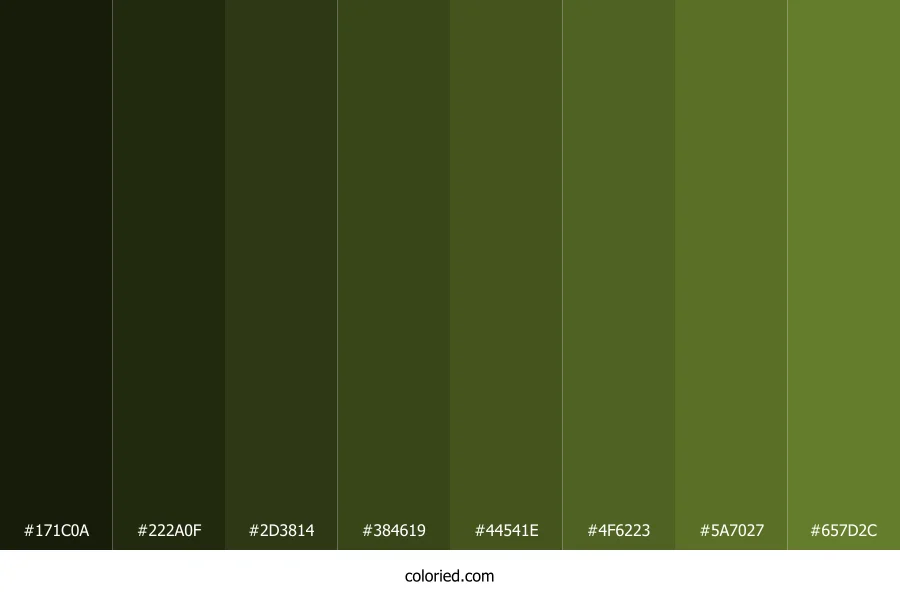 | #657D2C | 101, 125, 44 | 78, 48%, 33% | 19%, 0%, 65%, 51% | oklch(0.553 0.111 124) |