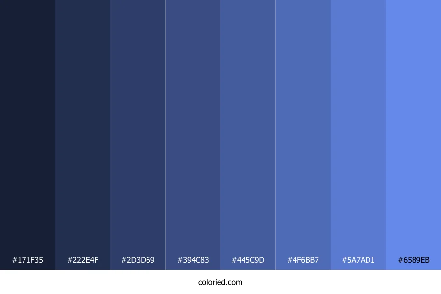 ![]() | #171F35 | 23, 31, 53 | 224, 39%, 15% | 57%, 42%, 0%, 79% | oklch(0.243 0.044 268) |