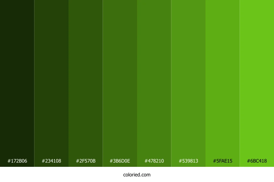 ![]() | #172B06 | 23, 43, 6 | 92, 76%, 10% | 47%, 0%, 86%, 83% | oklch(0.263 0.065 134) |