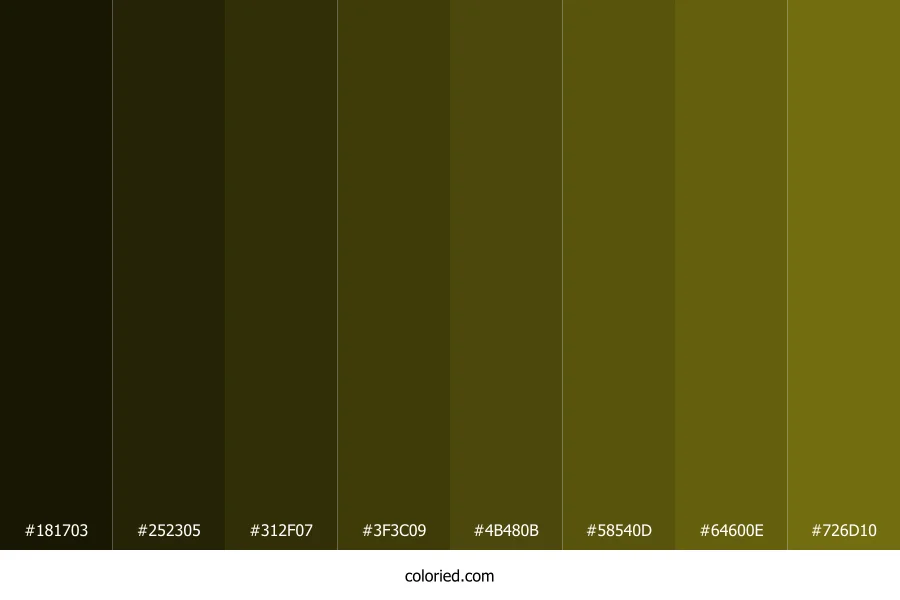 | #726D10 | 114, 109, 16 | 57, 75%, 25% | 0%, 4%, 86%, 55% | oklch(0.523 0.106 106) |