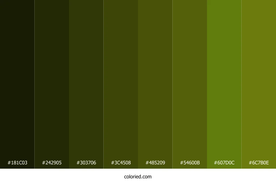 ![]() | #181C03 | 24, 28, 3 | 70, 81%, 6% | 14%, 0%, 89%, 89% | oklch(0.215 0.044 117) |