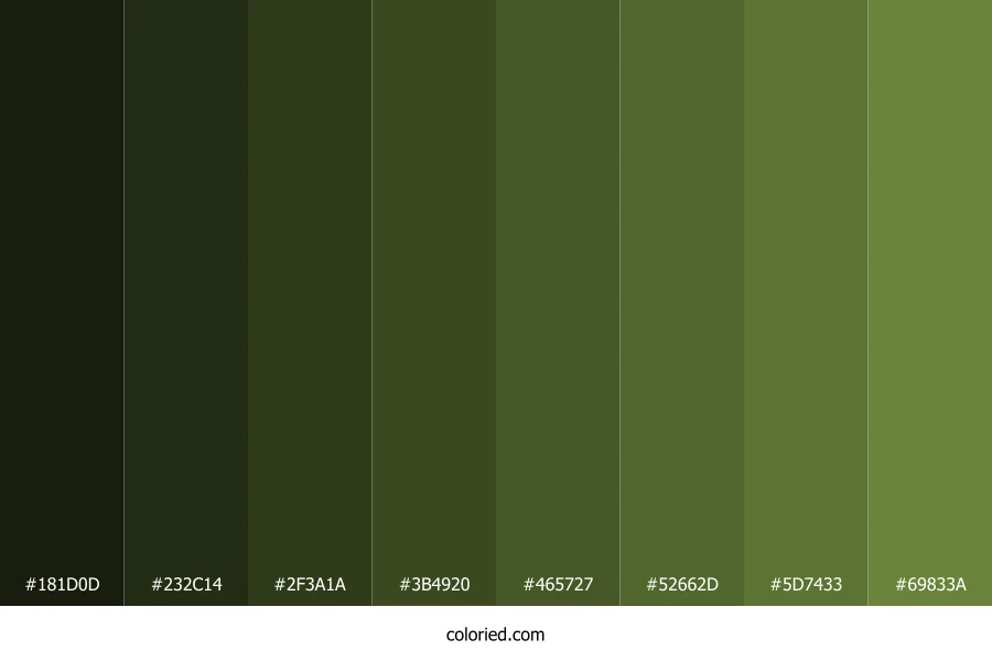 ![]() | #181D0D | 24, 29, 13 | 79, 38%, 8% | 17%, 0%, 55%, 89% | oklch(0.220 0.030 123) |