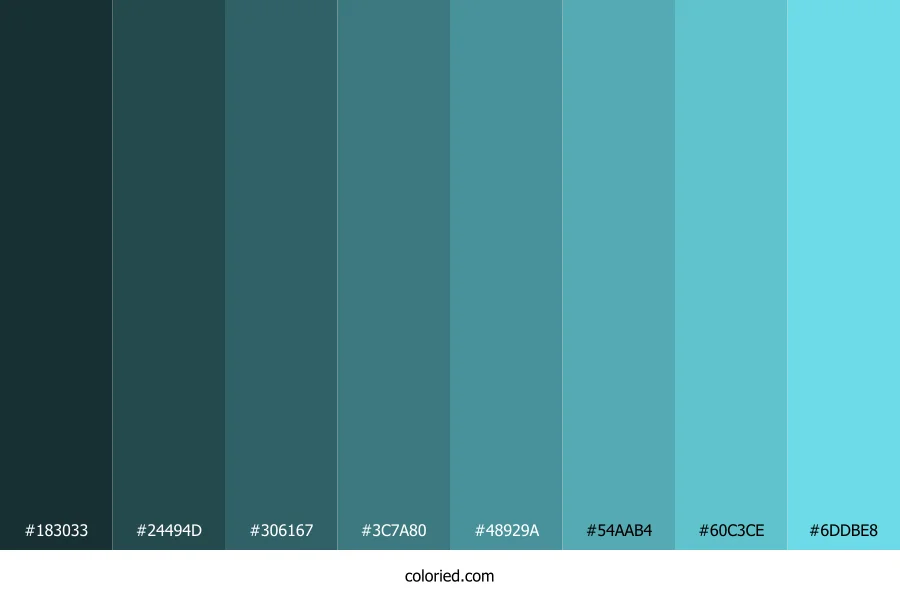 ![]() | #183033 | 24, 48, 51 | 187, 36%, 15% | 53%, 6%, 0%, 80% | oklch(0.291 0.030 206) |