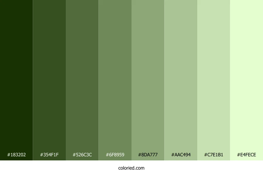 | #354F1F | 53, 79, 31 | 92, 44%, 22% | 33%, 0%, 61%, 69% | oklch(0.394 0.080 133) | |