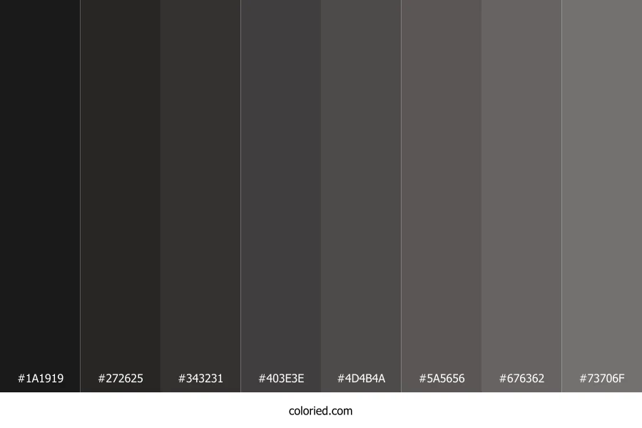 ![]() | #1A1919 | 26, 25, 25 | 0, 2%, 10% | 0%, 4%, 4%, 90% | oklch(0.215 0.002 17) |