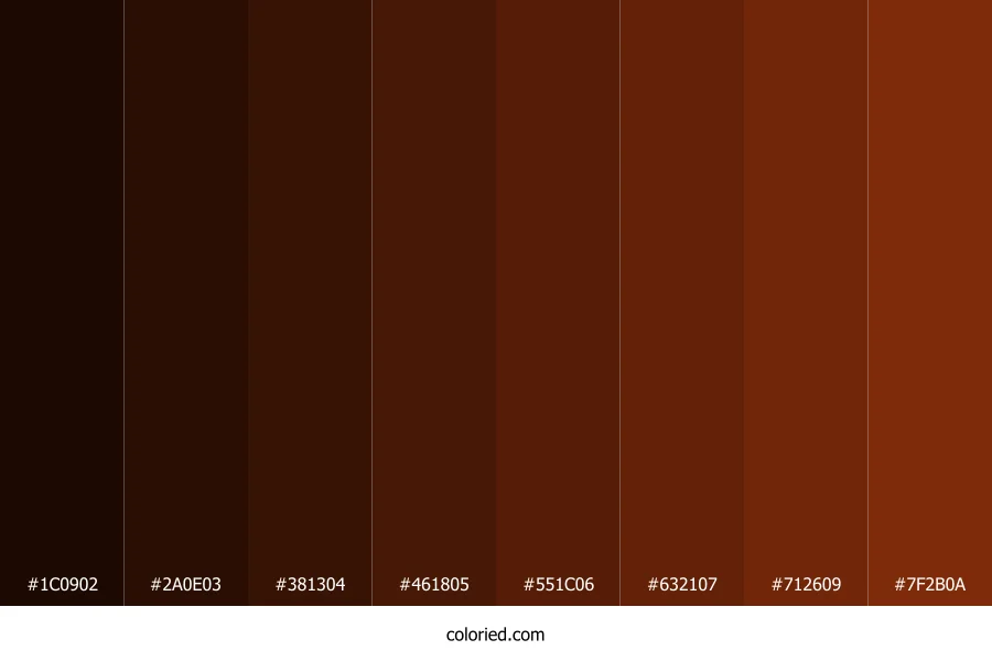 | #7F2B0A | 127, 43, 10 | 17, 85%, 27% | 0%, 66%, 92%, 50% | oklch(0.410 0.123 39) |