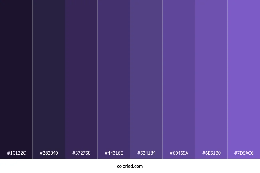 ![]() | #1C132C | 28, 19, 44 | 262, 40%, 12% | 36%, 57%, 0%, 83% | oklch(0.212 0.049 299) |