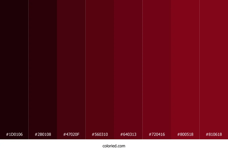 ![]() | #1D0106 | 29, 1, 6 | 349, 93%, 6% | 0%, 97%, 79%, 89% | oklch(0.151 0.055 11) |