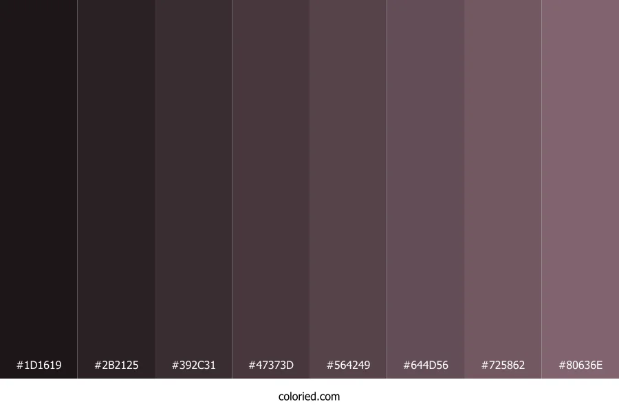| #2B2125 | 43, 33, 37 | 336, 13%, 15% | 0%, 23%, 14%, 83% | oklch(0.261 0.017 352) | |
