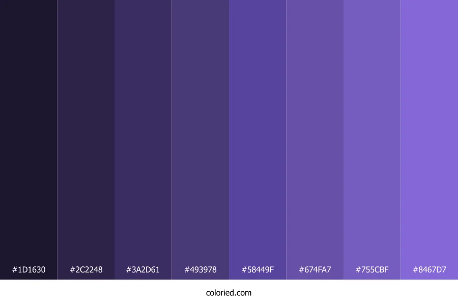![]() | #1D1630 | 29, 22, 48 | 256, 37%, 14% | 40%, 54%, 0%, 81% | oklch(0.223 0.050 294) |