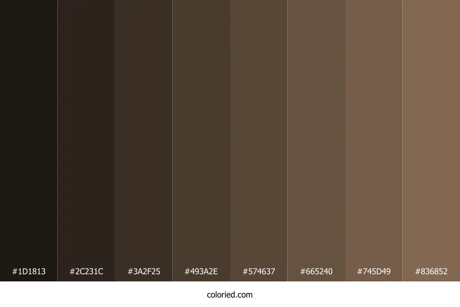 | #745D49 | 116, 93, 73 | 28, 23%, 37% | 0%, 20%, 37%, 55% | oklch(0.496 0.043 63) | |