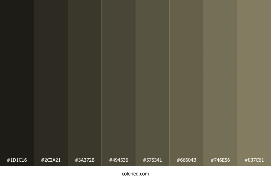 ![]() | #1D1C16 | 29, 28, 22 | 51, 14%, 10% | 0%, 3%, 24%, 89% | oklch(0.225 0.011 99) |