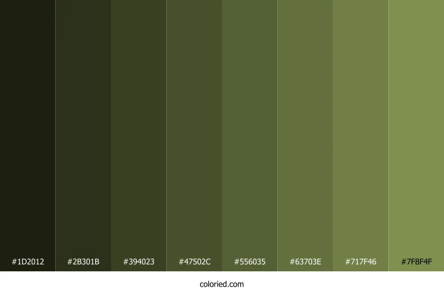 ![]() | #1D2012 | 29, 32, 18 | 73, 28%, 10% | 9%, 0%, 44%, 87% | oklch(0.236 0.026 118) |
