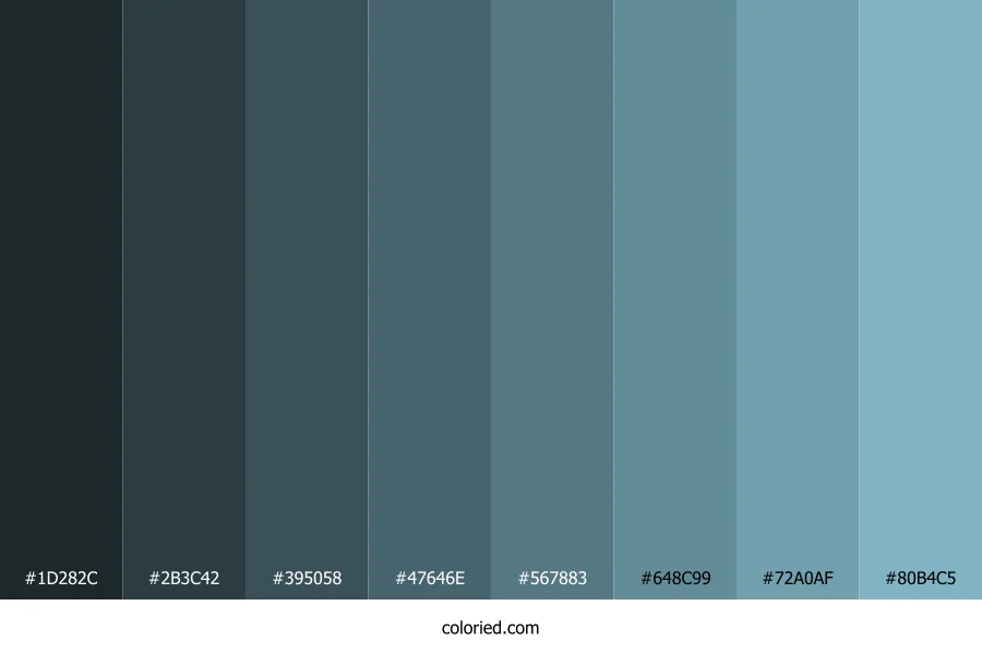 ![]() | #1D282C | 29, 40, 44 | 196, 21%, 14% | 34%, 9%, 0%, 83% | oklch(0.268 0.017 222) |