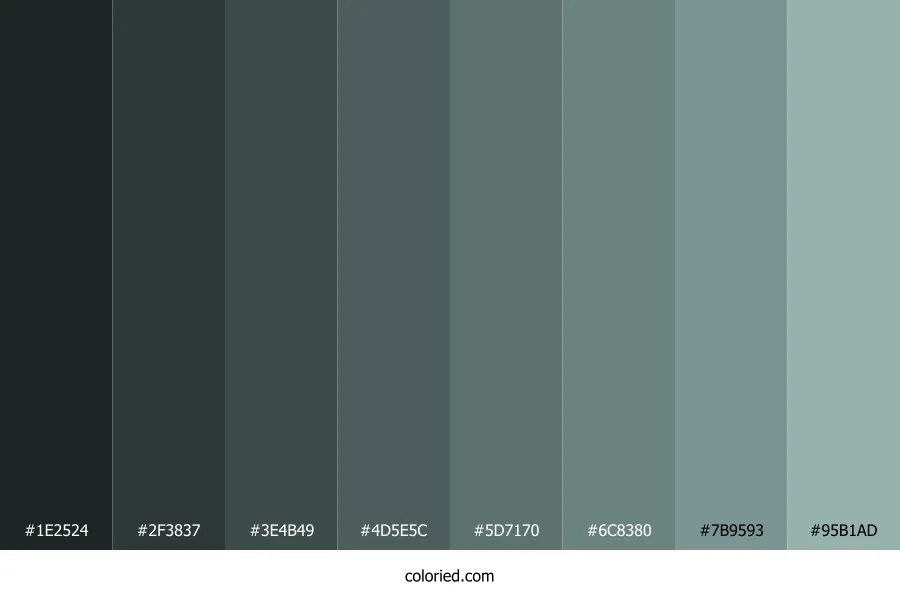 ![]() | #1E2524 | 30, 37, 36 | 171, 10%, 13% | 19%, 0%, 3%, 85% | oklch(0.257 0.010 186) |