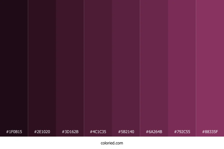 ![]() | #1F0B15 | 31, 11, 21 | 330, 48%, 8% | 0%, 65%, 32%, 88% | oklch(0.185 0.038 350) |