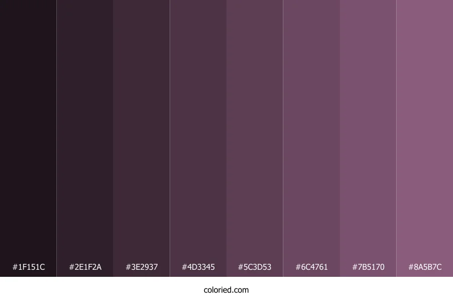 ![]() | #1F151C | 31, 21, 28 | 318, 19%, 10% | 0%, 32%, 10%, 88% | oklch(0.211 0.021 338) |