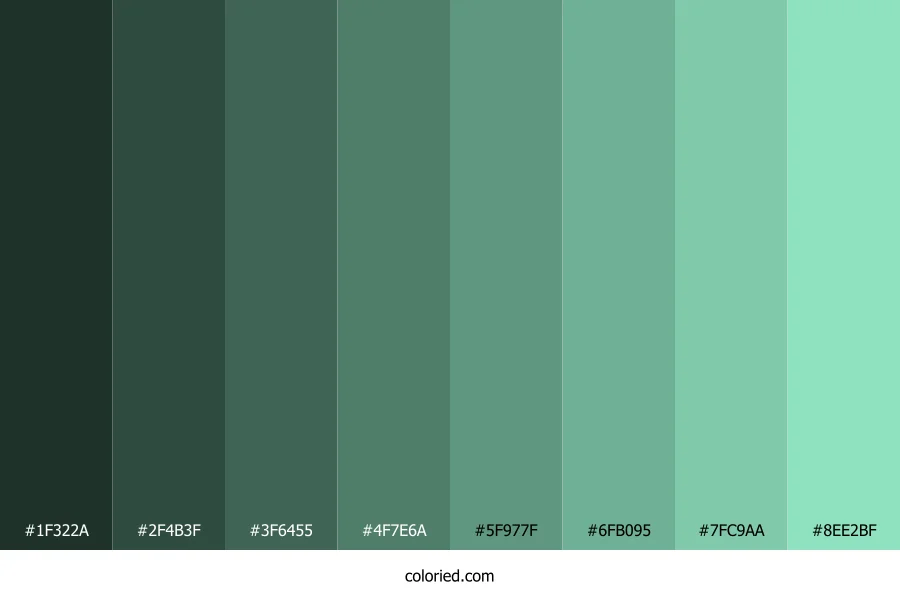 ![]() | #1F322A | 31, 50, 42 | 155, 23%, 16% | 38%, 0%, 16%, 80% | oklch(0.298 0.029 166) |