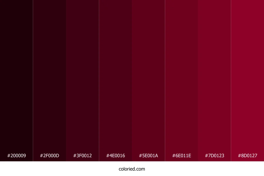 | #7D0123 | 125, 1, 35 | 344, 98%, 25% | 0%, 99%, 72%, 51% | oklch(0.375 0.149 17) | |