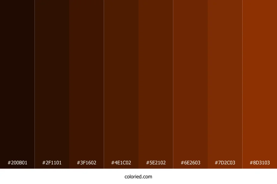 | #8D3103 | 141, 49, 3 | 20, 96%, 28% | 0%, 65%, 98%, 45% | oklch(0.443 0.134 41) |