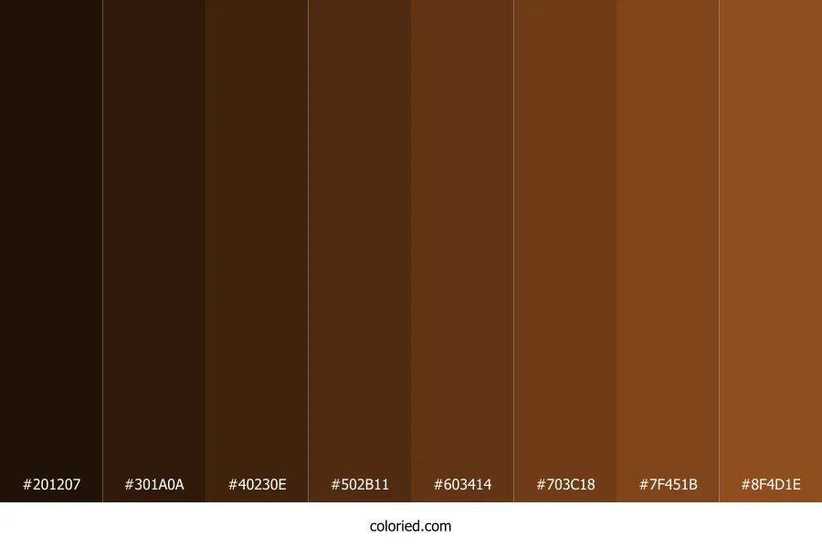 | #8F4D1E | 143, 77, 30 | 25, 65%, 34% | 0%, 46%, 79%, 44% | oklch(0.492 0.107 52) |