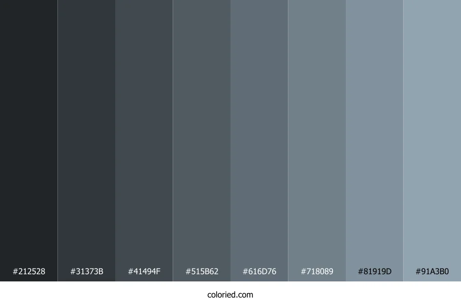 ![]() | #212528 | 33, 37, 40 | 206, 10%, 14% | 18%, 7%, 0%, 84% | oklch(0.262 0.008 240) |