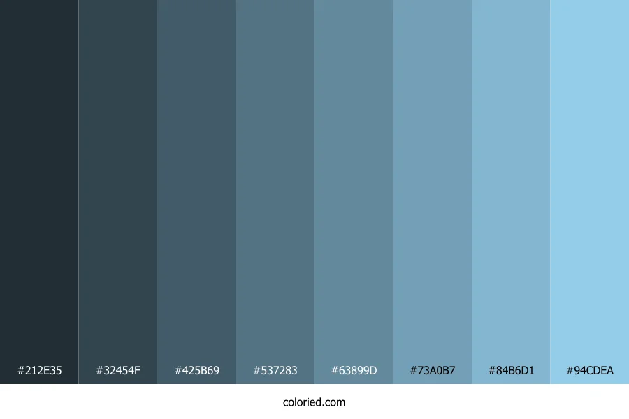 ![]() | #212E35 | 33, 46, 53 | 201, 23%, 17% | 38%, 13%, 0%, 79% | oklch(0.292 0.022 232) |