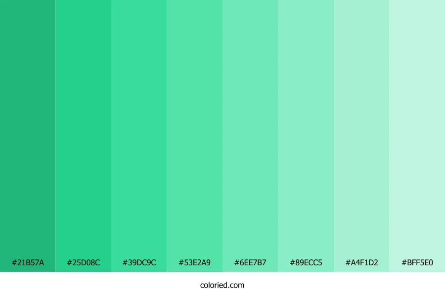 ![]() | #21B57A | 33, 181, 122 | 156, 69%, 42% | 82%, 0%, 33%, 29% | oklch(0.686 0.147 160) |