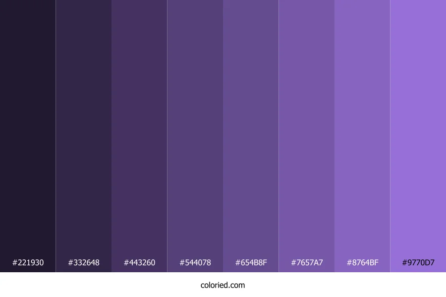 ![]() | #221930 | 34, 25, 48 | 263, 32%, 14% | 29%, 48%, 0%, 81% | oklch(0.236 0.045 301) |