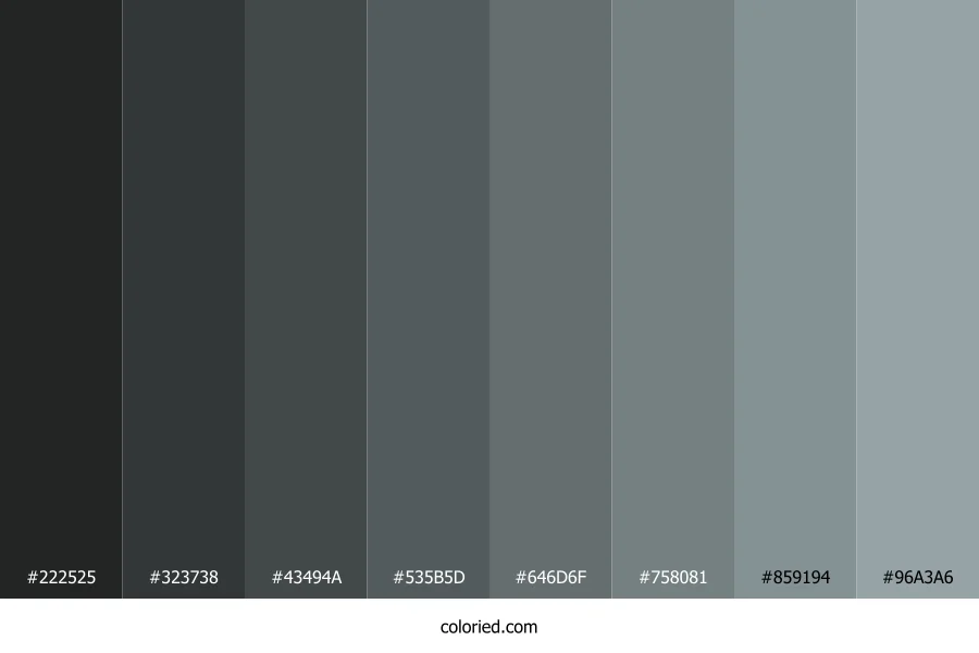 | #535B5D | 83, 91, 93 | 192, 6%, 35% | 11%, 2%, 0%, 64% | oklch(0.465 0.011 215) | |
