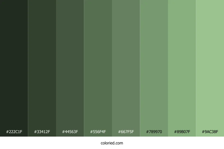![]() | #222C1F | 34, 44, 31 | 106, 17%, 15% | 23%, 0%, 30%, 83% | oklch(0.279 0.027 139) |