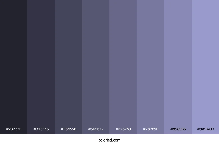 ![]() | #23232E | 35, 35, 46 | 240, 14%, 16% | 24%, 24%, 0%, 82% | oklch(0.261 0.021 285) |