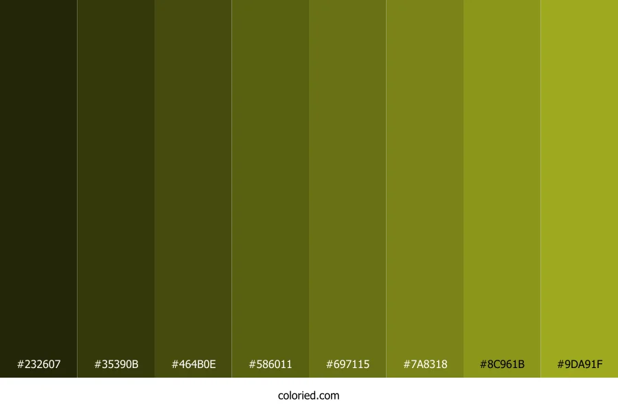 | #9DA91F | 157, 169, 31 | 65, 69%, 39% | 7%, 0%, 82%, 34% | oklch(0.702 0.150 115) |