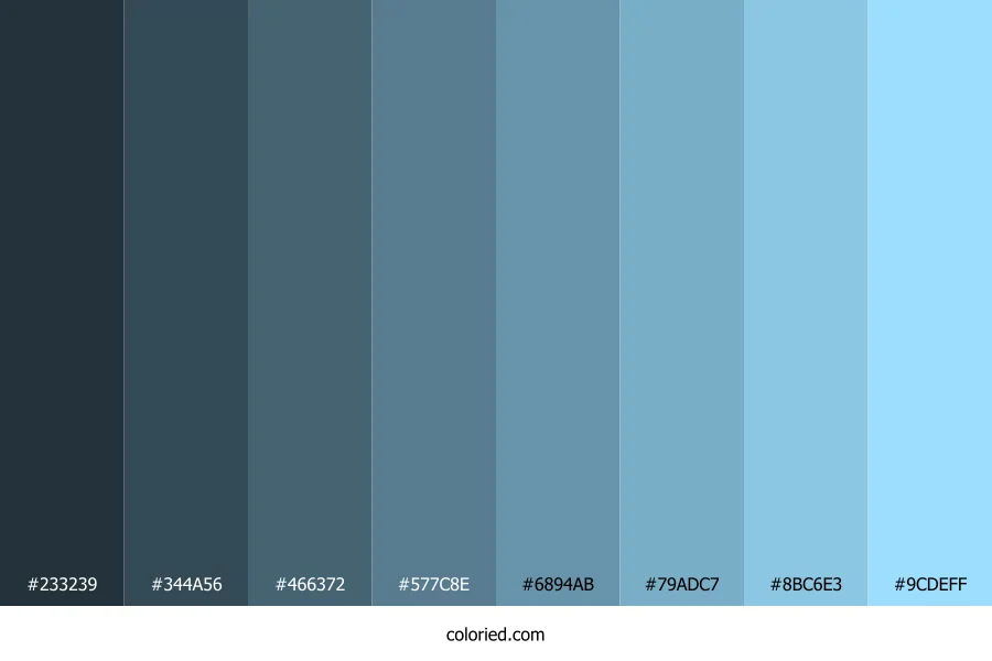 ![]() | #233239 | 35, 50, 57 | 199, 24%, 18% | 39%, 12%, 0%, 78% | oklch(0.307 0.024 228) |